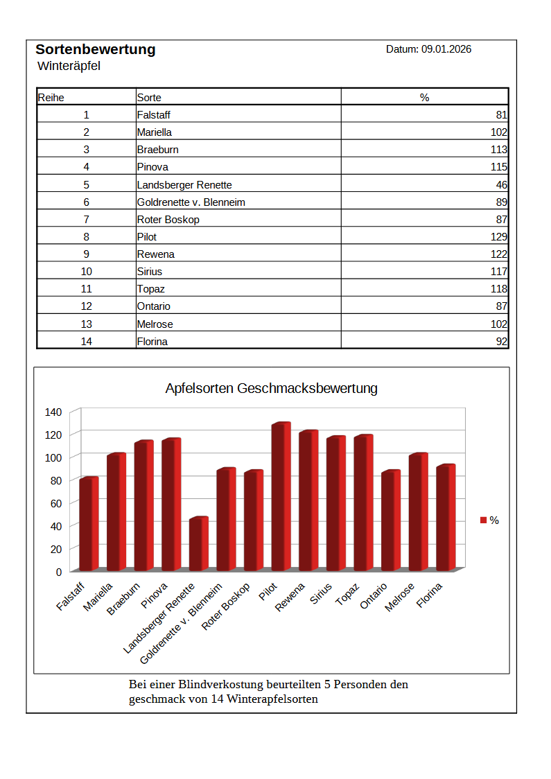 Diverse Apfelsorten wurden von 5 Testpersonen bewertet.